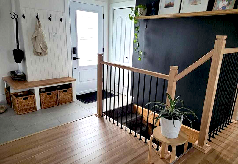 Banc d’entrée pratique avec rangement, coin banquette sur mesure, moulures élégantes et nouveau plancher en bois et en céramique.